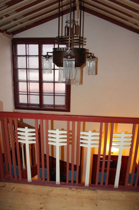 V dolní části, v místech, kde je dneska pokladna, bývala dřív kuchyň, na stěně je vidět otvor do komína, před nímž stávala velká plotna. My ale vystoupáme po krásně tvarovaném dřevěném schodišti na horní galerii.